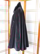 Cape en velours de coton noir et velours frappé en polyester (col et ouverture). Doublure imprimée (commande sur mesure).