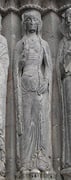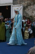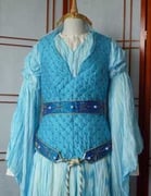 -> d'une robe en soie bleue appelée bliaut, de coupe droite et froncée aux épaules, avec des manches larges et longues, froncées en deux endroits au haut des bras