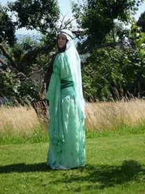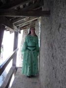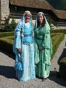 -> d'une robe en soie verte appelée "bliaut", de coupe droite et froncée aux épaules, avec des manches larges et longues, froncées en deux endroits au haut des bras
