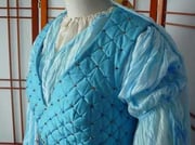 -> d'un corsage en soie doupion bleue très ajusté et lacé au dos. Celui-ci comporte plusieurs couches et on cousait à travers toutes celles-ci des lignes en diagonale avec du fil d'or afin de former des croisillons, et sur ceux-ci étaient fixés des perles ou des pierres précieuses (ici des cristaux de Swarovski)