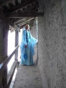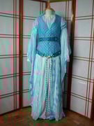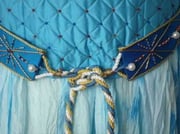 -> d'une ceinture en soie bleue décorée, croisée au dos et nouée d'un double noeud plat au devant. Les cordons pendaient alors presque jusqu'au sol