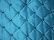 On suppose que le corsage (ici en doupion de soie) était fait de plusieurs couches d'un tissu moyennement épais tenues ensemble par des surpiqûres en fils d'or, d'argent ou de couleur; celles-ci se faisaient de préférence en diagonale pour avoir un effet nid d'abeille. Des pierres précieuses (ici des cristaux de Swarovskis) pouvaient être cousues à chaque croisement des fils d'or; on trouvait aussi des pierreries et des perles au milieu des losanges, ou les deux à la fois pour un effet plus riche. Le corsage est lacé au dos.