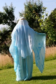 -> d'un voile rond en mousseline de soie bleue, retenu par une couronne.